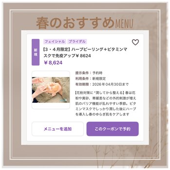 こんにちは!今回は、春にぴったりの【花粉対策に“潤してから整える”贅沢な育肌ハーブピーリング】をご紹介します!